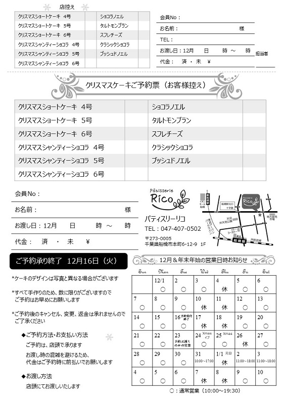 クリスマスケーキのご予約承ります 12月16日までの承りとなります